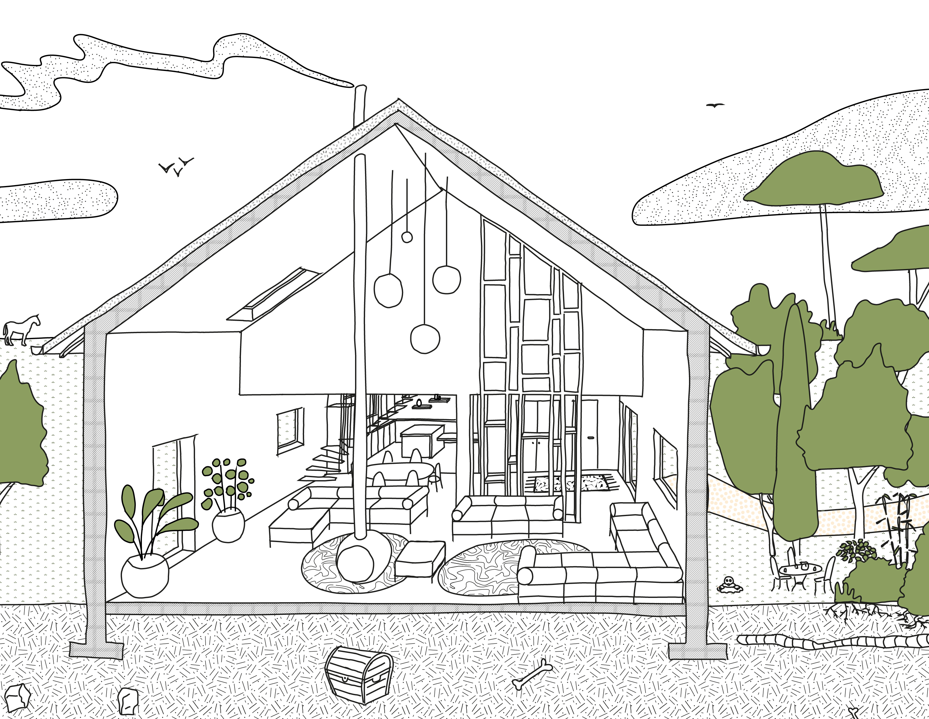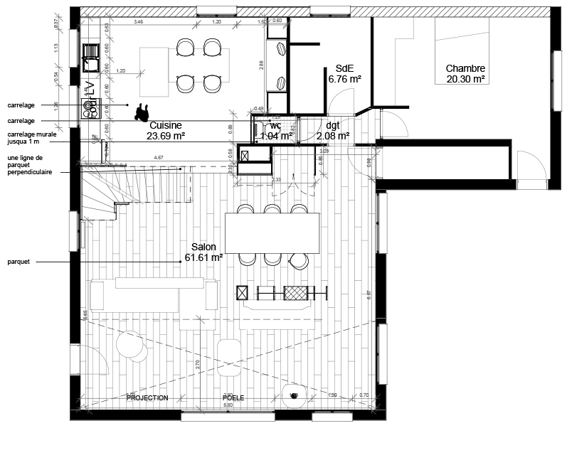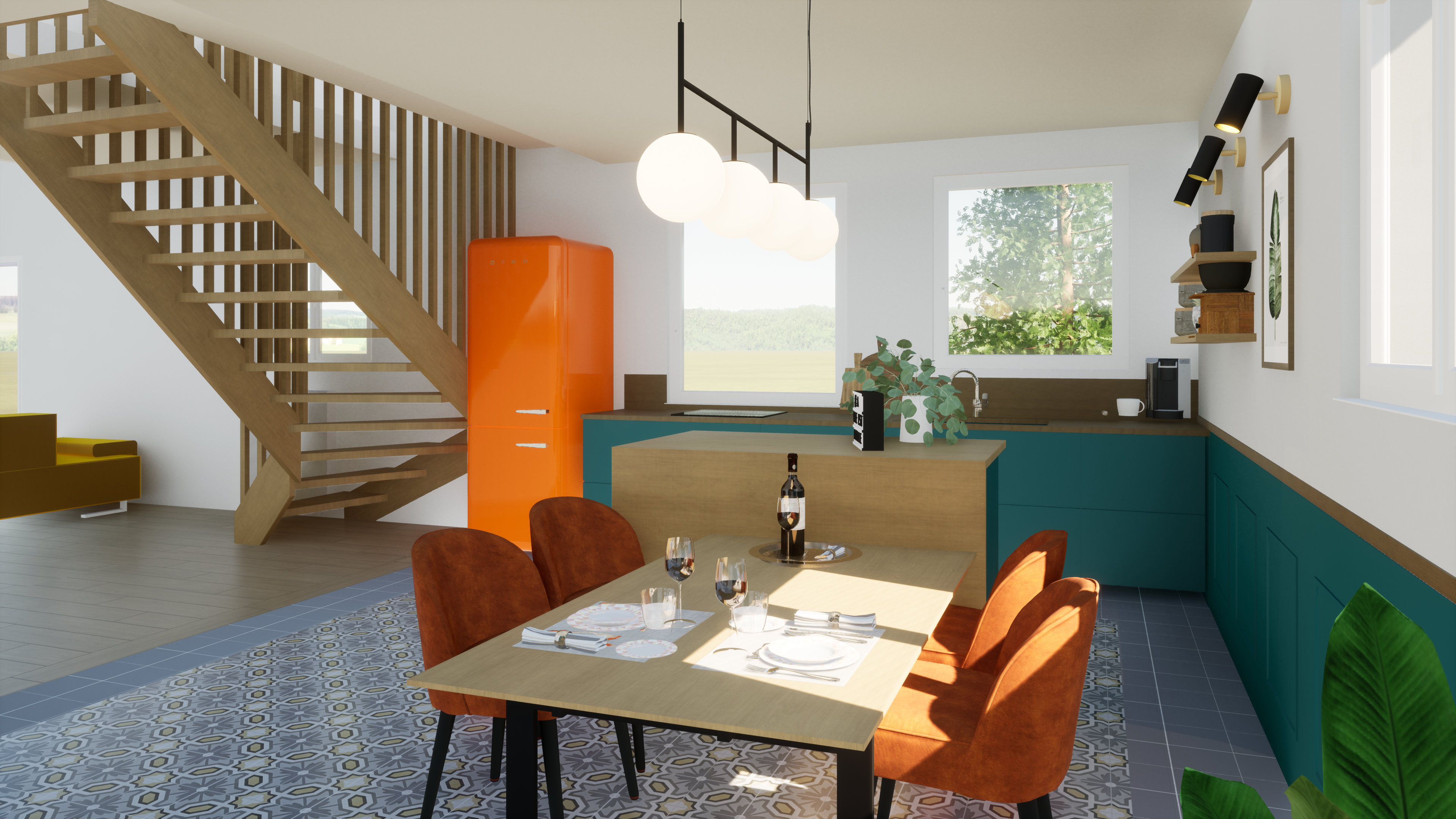 Réalisée pour des habitants fraîchement arrivées dans la région et désireux de se mettre au vert, cette rénovation a chercher à réorgansier les espaces afin de différentier les fonctions dans l’immense pièce de vie de 80m². L’utilisation de la couleur et de dispositifs achitecturaux ont permis de diviser l’espace sans le cloisonner. Une double hauteur a été percée dans le salon dont les grandes dimensions nécessitaient une certaine amplitude verticales. Ce volume ouvert, moins imposant que ludique, a permis de créer de nouveaux points de vues depuis l’étage.