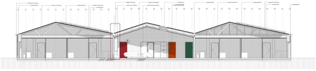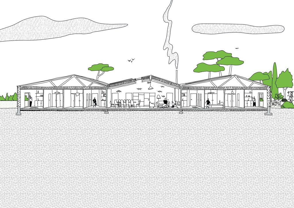 Colisée, maîtrise d’ouvrage engagée dans la transition énergétique et la mise en place de structure d’accueil de qualité pour les personnes âgées, nous a commandé la réalisation d’un module reproductible de colocation pour séniors. Le projet est exemplaire tant par sa programmation que par ses ambitions environnementales puisqu’il vise niveau le E4C2. Ce bâtiment est ainsi à énergie positive grâce à une maîtrise totale de la consommation énergétique, à l’implantation de panneaux solaires intégrés à l’architecture et à un système de collecte et de réutilisation des eaux pluviales. Le bilan carbone est extrêmement réduit grâce à l’utilisation de mur à ossature bois et remplissage paille, de béton bas carbone, de terre crue et de bois. Par ailleurs l’architecture a été imaginée de manière à pouvoir s’orienter et s’adapter aux différentes configurations de terrain et de climat. Un système de réutilisation des eaux de pluie dans les sanitaires participe à rendre ce bâtiment sobre.