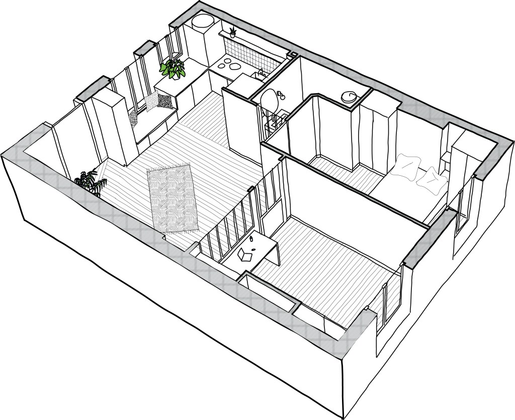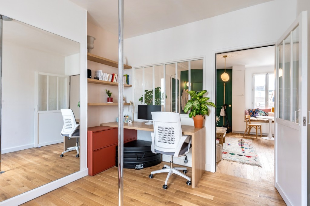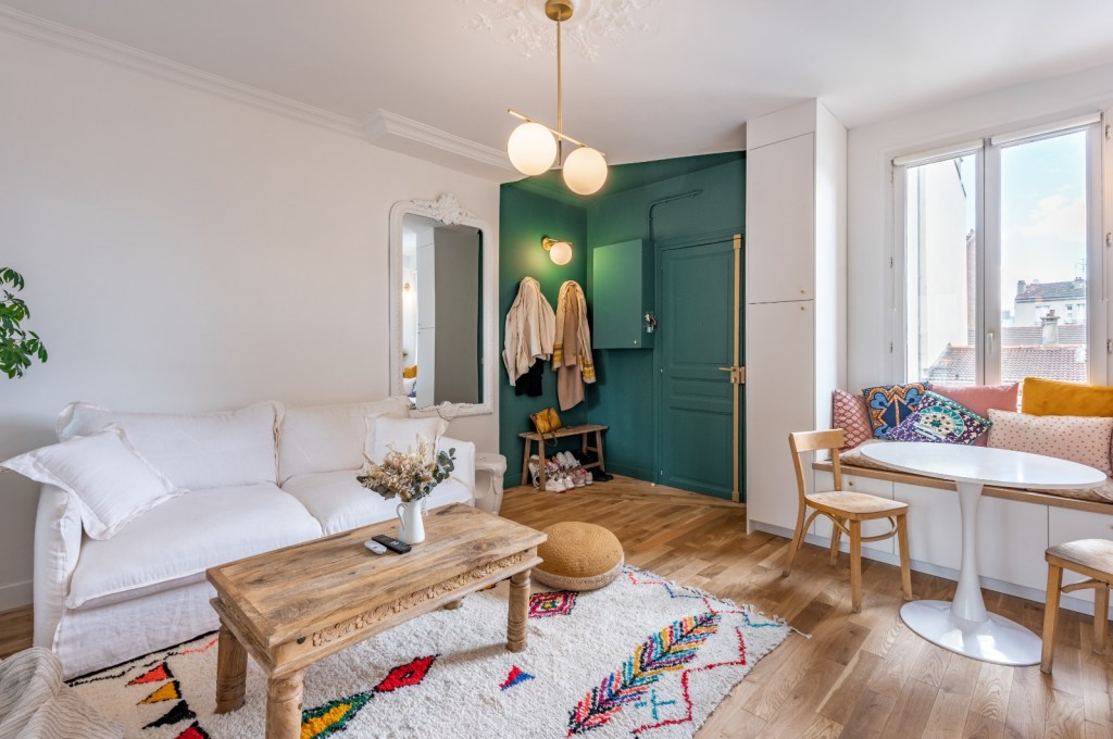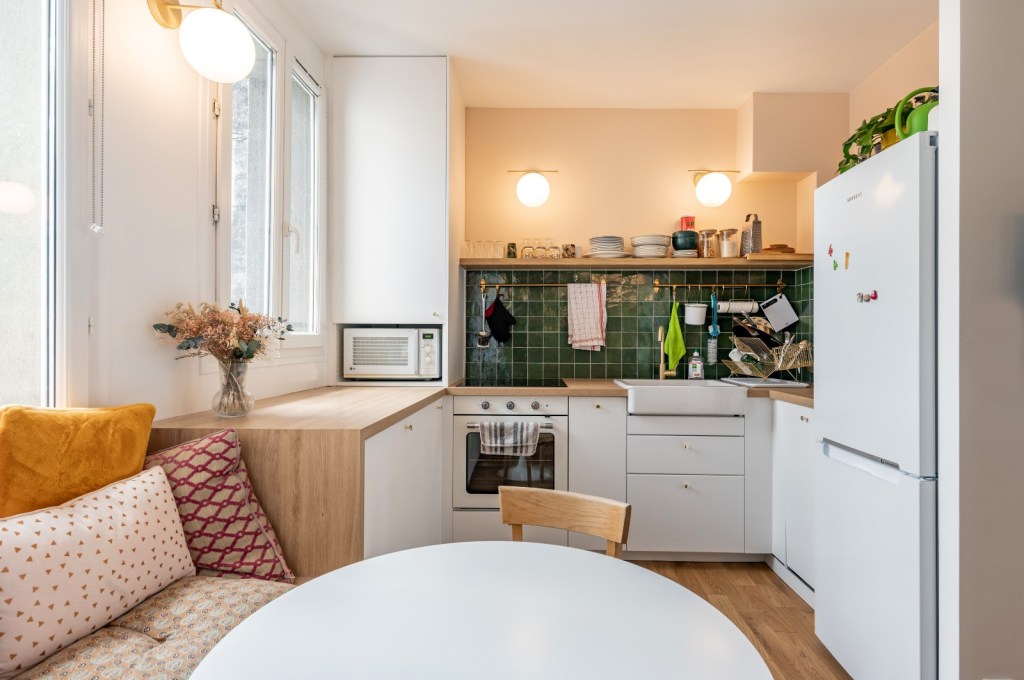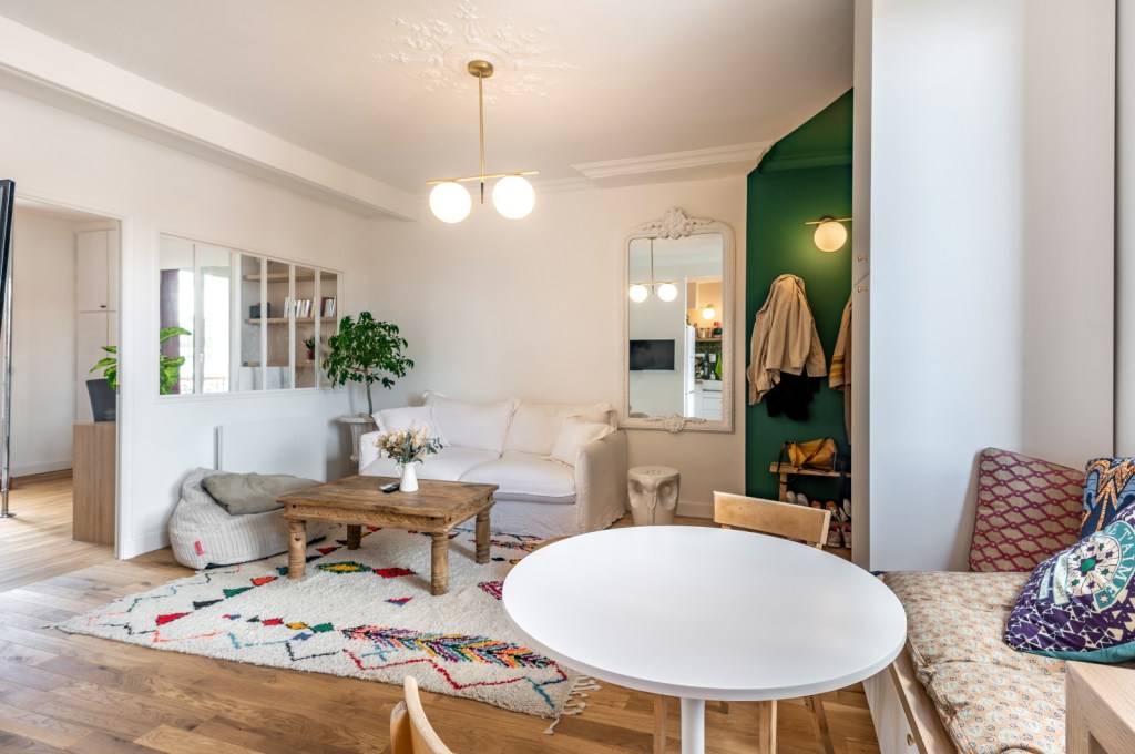 Doté d’un budget limité, cette rénovation complète inclue la réalisation de mobilier sur mesure et le choix de la décoration. L’appartement s’organise autour de la pièce de vie, qui concentre les fonctions d’entrée et de cuisine. Cette dernière a été agrandie par l’ouverture d’une cloison, le déplacement d’une autre et surtout l’amélioration de son éclairage naturel grâce à la création d’une verrière et l’utilisation de portes vitrées. Cette pièce autrefois fermée sur elle même, est aujourd’hui baignée de lumière et animée par des jeux de plans et de transparence laissant deviner le reste de l’appartement. Des touches colorées et un jeu d’orientation des parquets a permis de différentier les espaces de l’entrée et de la cuisine. La cuisine s’ouvre sur la pièce de vie et se transforme en banquette pour créer un espace repas cosy et optimisé qui ne grinotte pas trop sur l’espace salon.