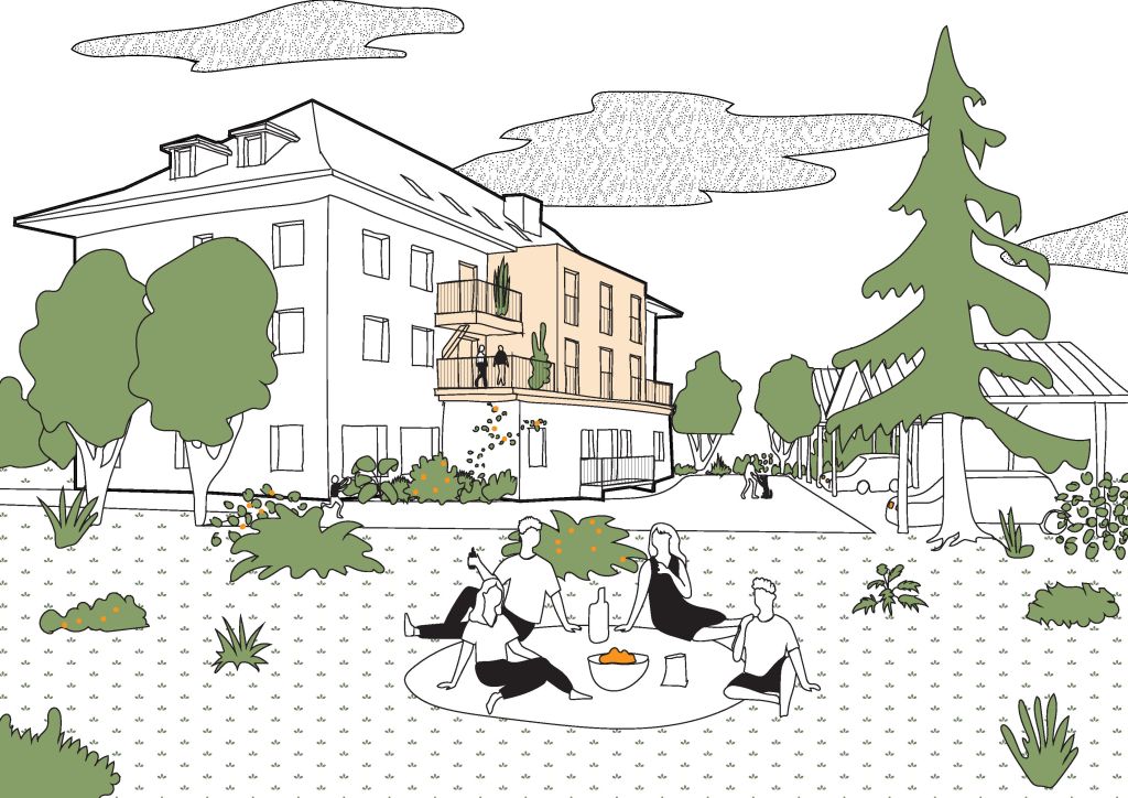 L’ancien hôtel des Pyrénées de la ville de Lannemezan, touché de plein fouet par la crise du covid et marqué par de longues années de service, ne demandait qu’à renaître de ses cendres. L’architecture existante a été intégralement conservée et complétée sur sa face arrière par une extension en mur à ossature bois permettant de créer de nouvelles terrasses et appartements. Ce nouveau volume vient habiller la façade autrefois marquée par les installations techniques et le manque d’entretien. Tous les appartements disposent d’un accès à l’extérieur et la majorité d’une vue dégagée sur la chaîne des Pyrénées. Les balcons existants ont été habillés de bois afin de leur donner une atmosphère plus chaude. Le socle du bâtiment prévoit des espaces communs, comme une salle de sport, un abri de jardin et des potagers partagés.